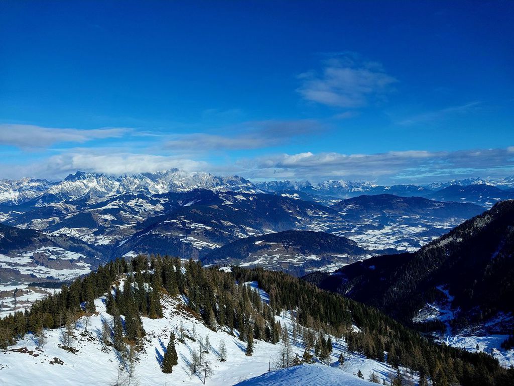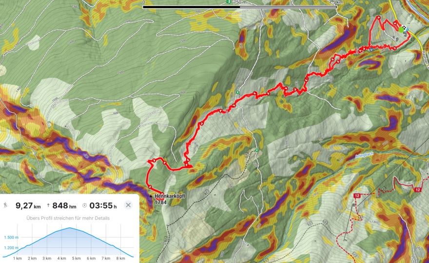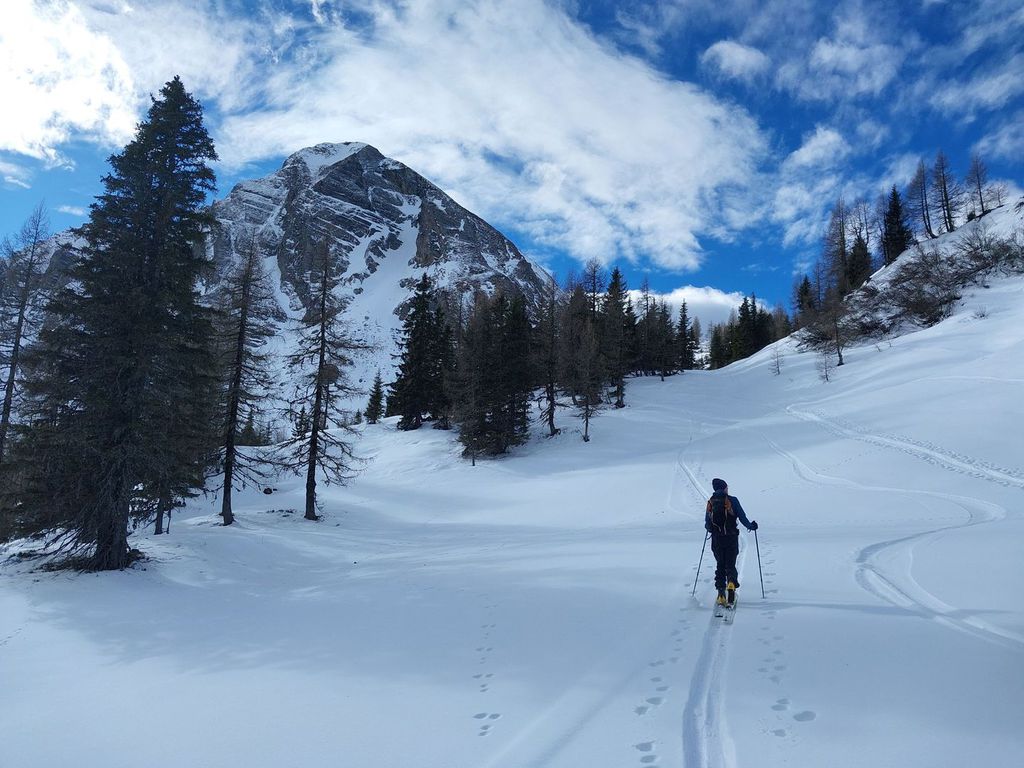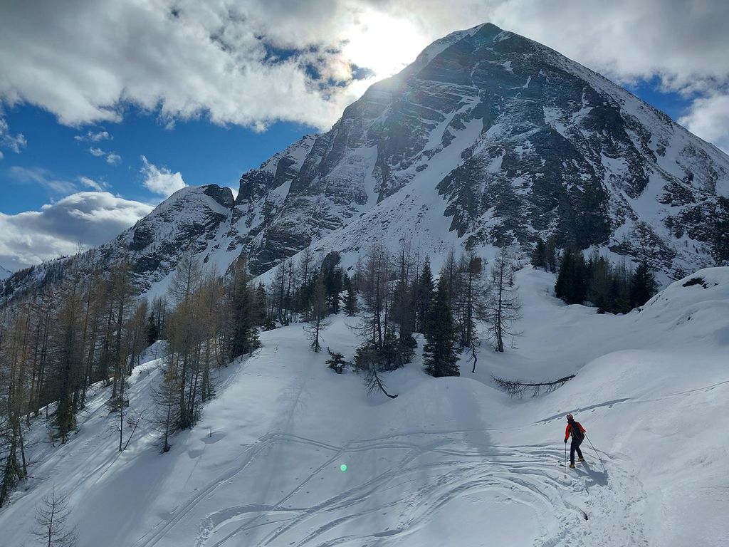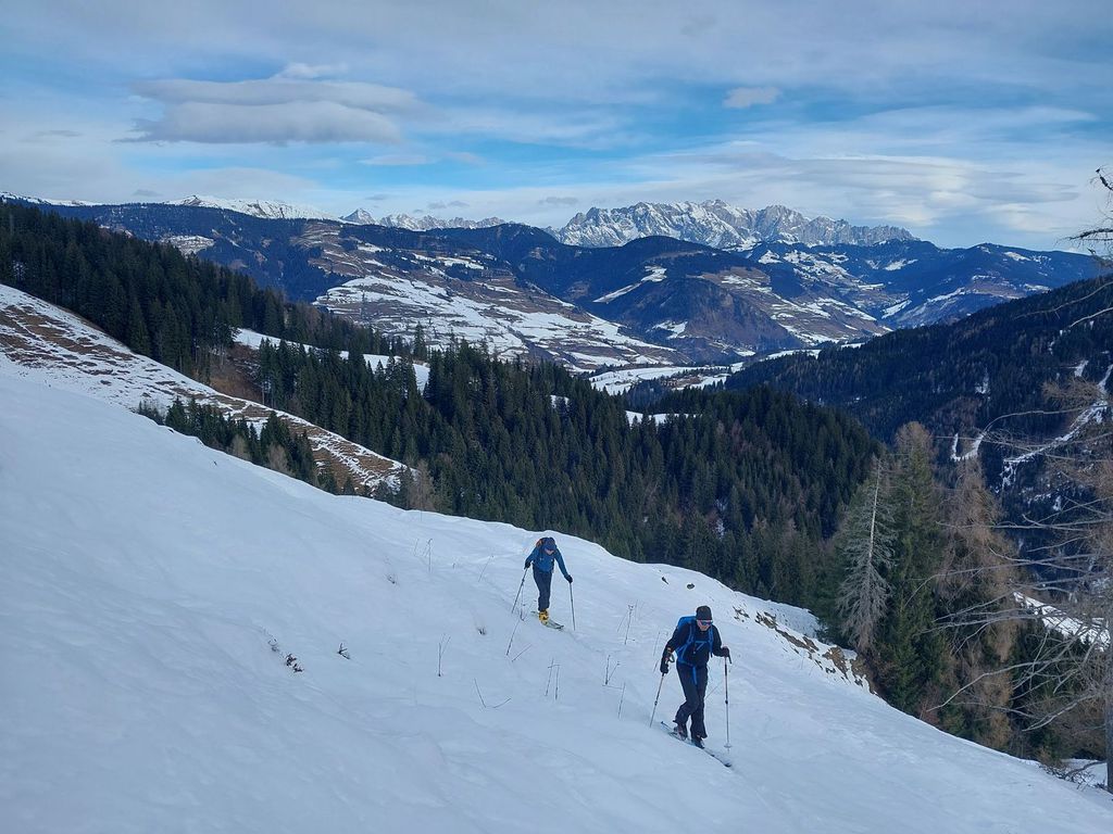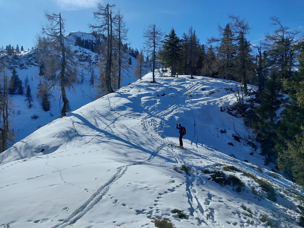 Hennkarköpfl (1784m), 848 hm, WS: Wohl eher selten gemachte Skitour, unserer ortsansässigen Vermieterin war noch nicht mal der Gipfel ein Begriff. Wir durften auch alles Spuren und fanden auch keine alten Abfahrtspuren vor. An sich aber eine Tour, die man schon mal machen kann, geht sie doch zum größten Teil über freie ost/nordostseitige Weideflächen, die nur mal auf 200 Wegmetern von einen dichteren Jungwald unterbrochen sind, durch den man in der Abfahrt besser die Ski kurz trägt. Oben raus über einen Forstweg hoch und die letzten paar Meter zu Fuß aber unschwierig auf den felsigen Gipfel. Abfahrt wie Aufstieg.
