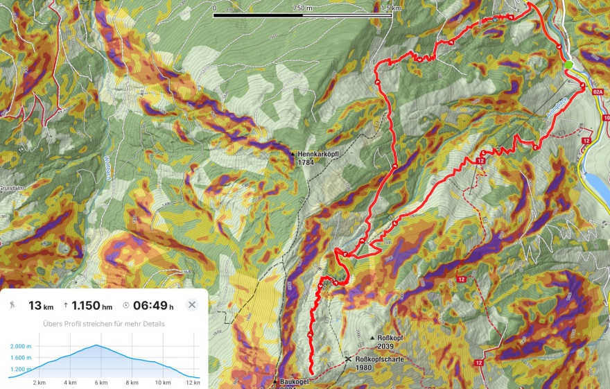 Namenlose Erhebung neben dem Roßkopf (2038 m), 1150 hm, WS: Ziel war eigentlich der Roßkopf (2039m), aber ob der sehr dürftigen Schneelage am Roßkopf erkoren wir eine gleich hohe Erhebung auf der anderen Seite der Roßkopfkarte zum Ziel, schlicht und ergreifend, weil man von dort aus abfahren konnte. Die Tour führte unten 300hm über einen Forstweg, der bei uns wegen Forstarbeitern aber leider geräumt war, und wir deshalb die Ski dort tragen durften. Danach kommen recht steinige Wiesen, für die die Schneehöhe leider auch zu dürr für eine materialschonende Abfahrt war. Im oberen Teil dann immerhin freies Skigelände, wo wir einige schöne Schwünge machen konnten. Ob der schlechten Schneelage unten beschlossen wir dann in der Abfahrt via eines Forstweg den unteren Teil der Skitour des Hennkarköpfl abzufahren, weil wir auch vom Tag vorher wussten, dass dort der Schnee für die Abfahrt bis ins Tal reicht. Wir durften dann halt die Ski noch etwa 500 Meter auf der Straße zum Auto zurücktragen.