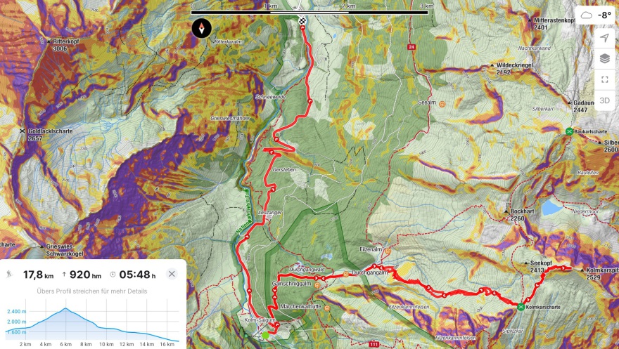 Etzenkopf (1848 m), 815 hm, WS-: Wohl auch eher selten gemacht, aber mitunter lohnend. Diese Tour startet im Salzachtal und führt ost- und nordseitig unten über Forstwege und oben schön freie Hänge auf den Gipfel. Den Aufstieg den wir genommen haben kann ich nicht empfehlen, da sich der Weg irgendwann in einem sehr steilen Waldstück verliert, wo wir dann auch mal die Ski abschnallen mussten und nur mittel leichter Baumkletterei wieder auf die eigentliche Route fanden. Es ist wohl besser so aufsteigen, wie wir es auch abgefahren sind, allerdings ist das dann auch von der Strecke her länger (5.4 vs. 7.3 km). Die oberen 350 Höhenmeter waren dafür immerhin ein Pulvertraum in wunderbarem Skigelände und die Abfahrt über die Froststraße sehr entspannt.