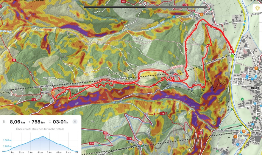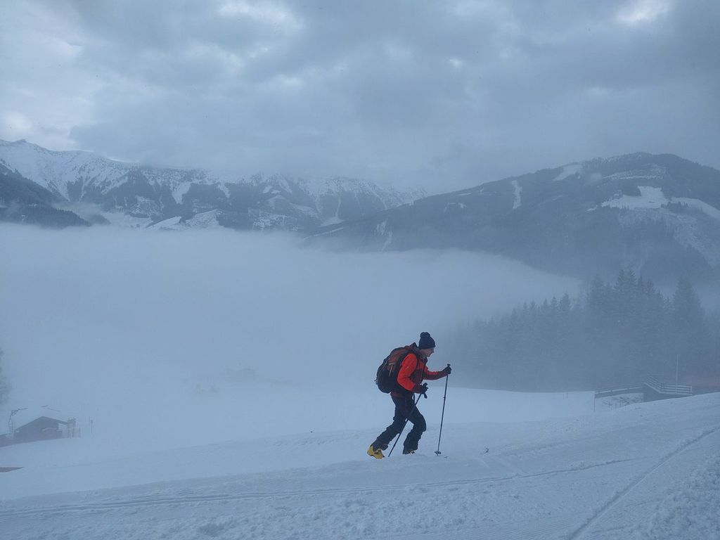 Skitour des Skigebietes Rauris (1685 m), 758 hm, L: An einem Tag schneite es und die Sicht war ziemlich mau, da bot sich die Skitour im Skigebiet Rauris an. Der Aufstieg ist hier sehr gut ausgeschildert und verläuft größtenteils weit abgetrennt von der Piste, so dass man den Abfahrenden nicht in die Quere kommt. Am Ziel (Waldalm) bot sich eine Einkehr an und die Abfahrt erfolgte entspannt über die Piste.