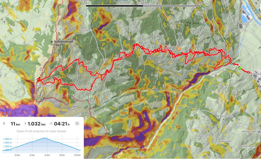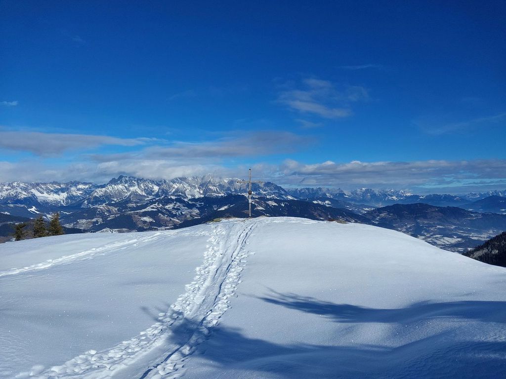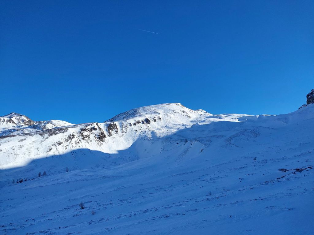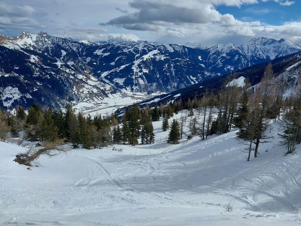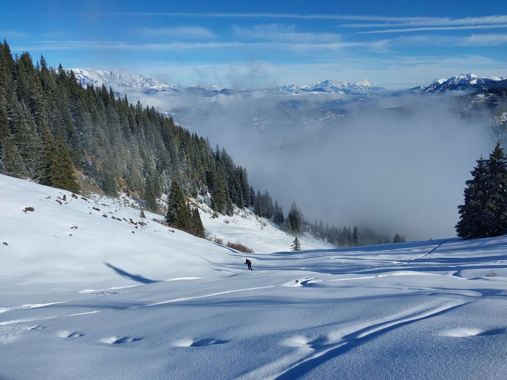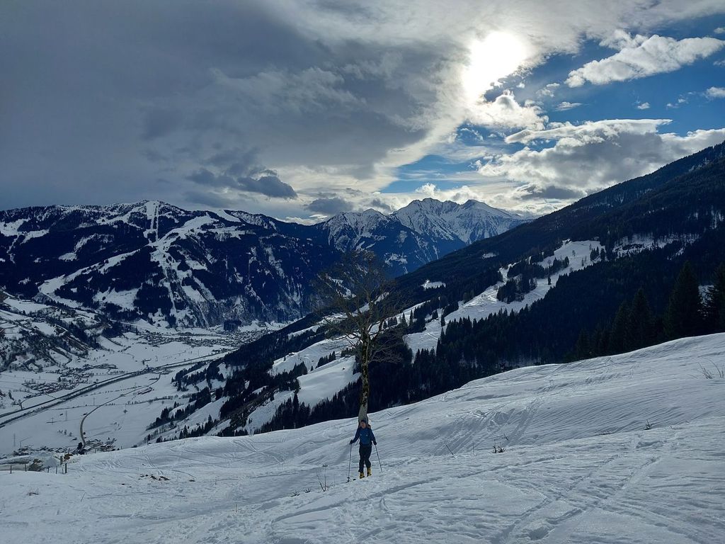 Hahnbalzköpfl (1895 m), 1032 hm, WS-: Die Tour startet vom Eingang des Gasteiner Tals und führt über ostseitige Weideflächen und durch recht lichten Wald, wo man auch mit eher knapper Schneelage unten gut durchkommt ohne sich den Belag auf den Ski zu ruinieren. Die Tour endet am Gipfelkreuz, was einige Meter höher liegt als der auf der Karte angegeben Gipfel. Abfahrt im oberen Teil über das freie steilere Gelände etwas südlich der Aufstiegsspur. Ober hatten wir super Pulver und unten dann feinen Sulz, der auch recht spaßig zu fahren war.