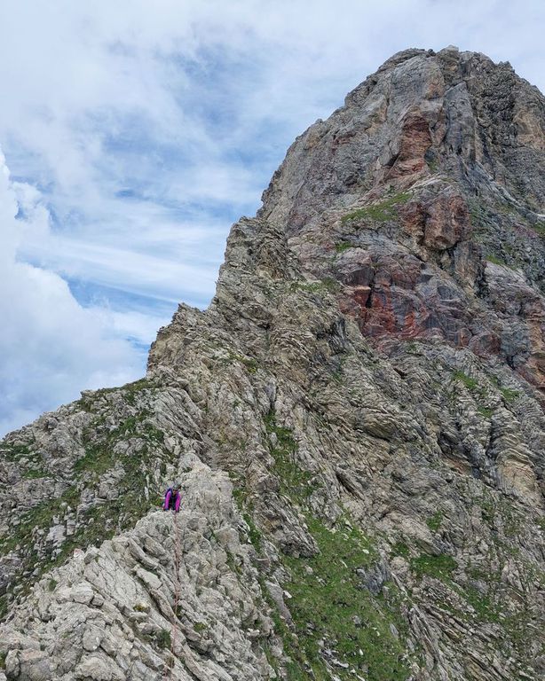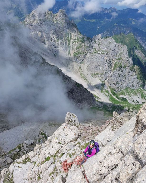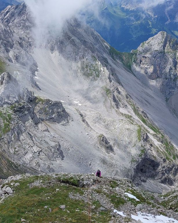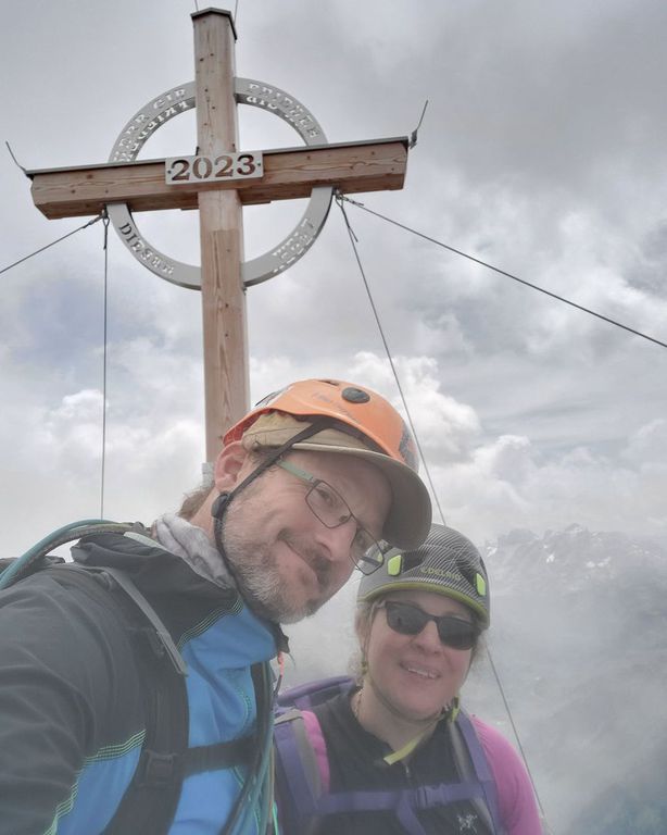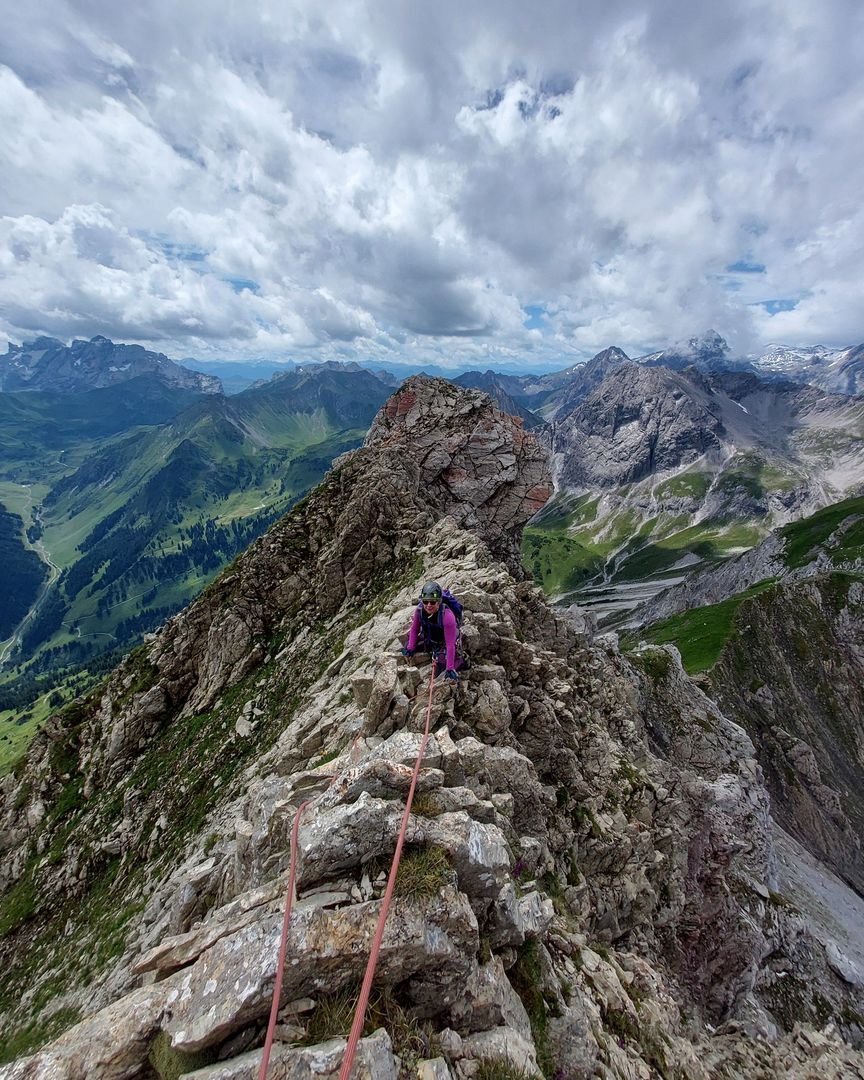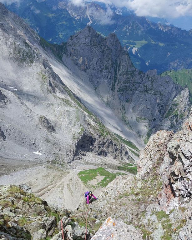 Mitte Juli war mit der Liebsten dann eine klassischer Alpinkletterei angesagt, nämlich auf die Zimba, auch bekannt unter dem „Matterhorn des Montafons“. Eine sehr markante Berggestalt die jetzt optisch aber eher nur entfernt ans Matterhorn erinnert, aber auch gut möglich, dass sich die Ähnlichkeit auf die teils vergleichbar bescheidene Felsqualität bezieht… Der Plan war eigentlich Anfahrt am Samstag, gemütlich die 700 hm zur Sarotla-Hütte von Brand aus aufsteigen, Sonntag weiter die nächsten 1000 hm auf die Zimba mit der Kletterei, dann Abstieg und heim. Blöderweise waren für Sonntag ab frühem Vormittag Gewitter gemeldet und der Gipfel der Zimba gehört zu den Plätzen, an denen man bei einem Gewitter tunlichst nicht sein sollte. Da das Wetter für Samstag stabil gemeldet war also Planänderung: Samstag um 3 Uhr morgens los gefahren, um 07:30 in Brand angekommen und weiter in einem Rutsch bsi auf den Gipfel der Zimba und von da aus Abstieg bis zur Sarotla-Hütte, an der wir zum Abendessen dann waren. 1700 hm incl. Viel Kletterei am Gipfel. Puuuuh, wir waren dann ganz schön durch. Aber die Kletterei oben war, obwohl es an einigen Stellen etwas schottrig war, schon toll. Bis zum Zimbajoch noch mehr oder minder über einen Wanderweg, dann etwas I-IIer Kletterei am kurzen Seil bis zur Sohmplatte. Da hieß es dann mal im teils recht abgespeckten Fels zuzupacken, obwohl nur IV-. Danach weiter in einigen Seillängen bzw. teils am kurzen Seil dem luftigen Westgrat folgend (II-IIIer Gelände) zum Gipfel, auf dem wir dann ob fortgeschrittener Stunde alleine waren. Retour auf dem gleichen Weg mit ein paar Mal abseilen. Zimba gemacht, toller Gipfel! Sonntag stiegen wir dann direkt nach dem Frühstück ab und schafften in Brand gerade noch eine Runde im Naturschwimmbad zu drehen, bevor es um 10 Uhr derb anfing zu Gewittern. Also alles richtig gemacht!