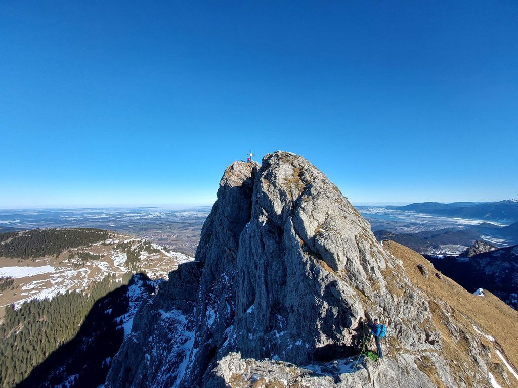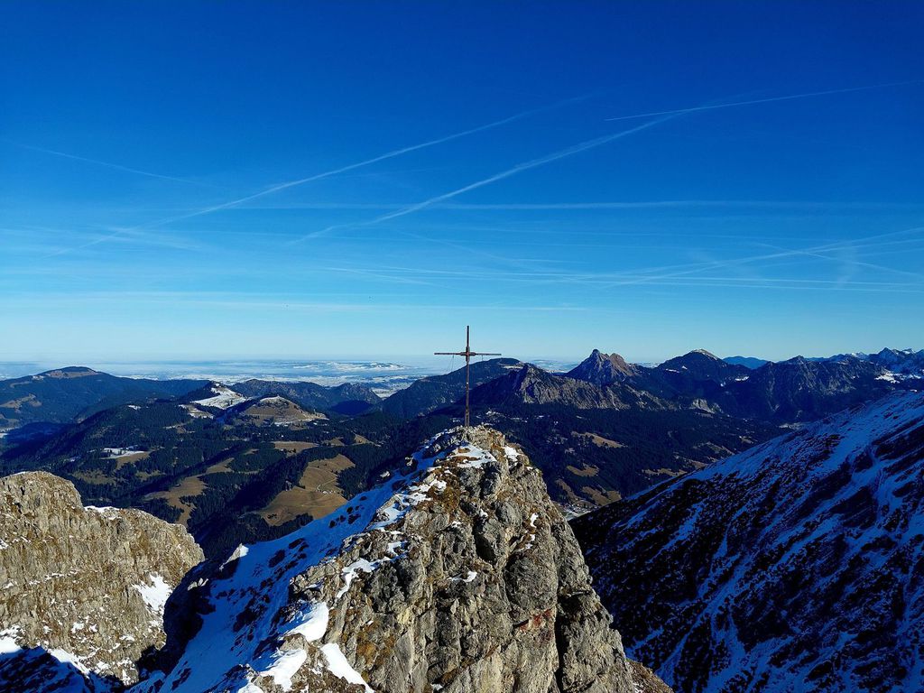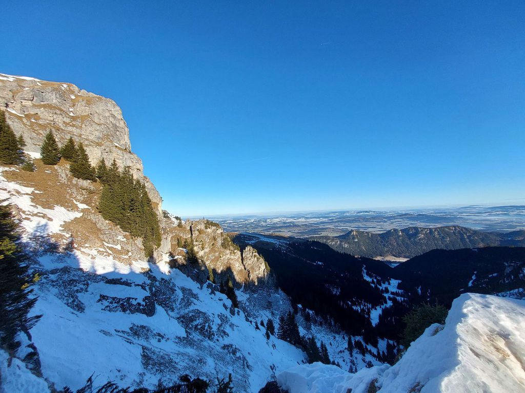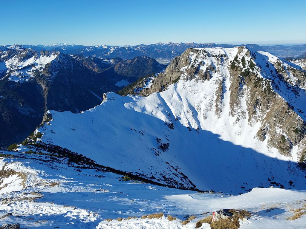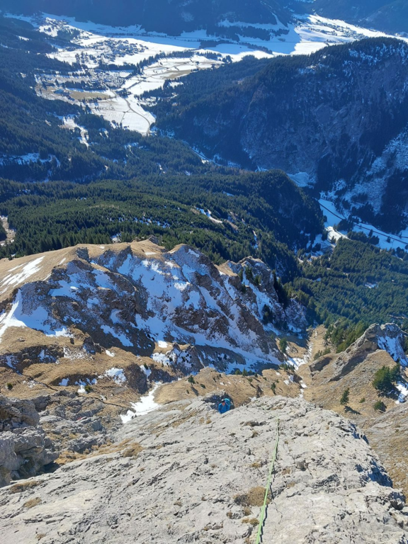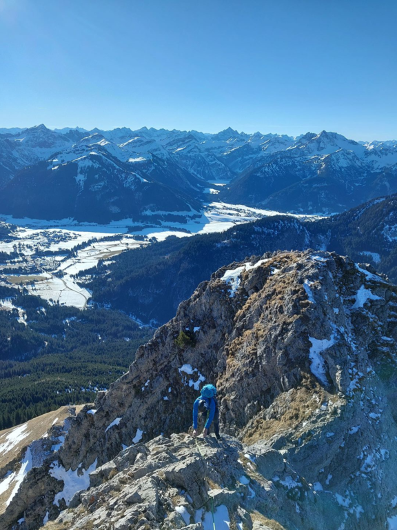 Blöderweise war der Schnee im November dann auch mehr oder minder der einzige der bis zwischen den Jahren gefallen war, wo ich mich wieder, eigentlich für Skitouren, in Schattwald im Tannheimer Tal einquartierte. Auch wenn es überall hieß, dass die Bedingungen nicht für Skitouren taugen, konnte ich am 27.12 doch noch, ohne zu tragen gerade so eine Skitour auf den Ponten machen. Unten lag gerade so viel (mit Eis drunter), dass es mit den Fellen unter den Ski hoch ging und ich über die Piste auch bis zum Ort abfahren konnte. Im Latschengürtel reichte der Schnee grad so und im schattigen Kar oben war er sogar unerwartet gut. So hate ich dann den Ponten bei bestem Wetter mit den Ski zwischen den Jahren völlig für mich alleine. Das kommt sicher auch nicht oft vor, aber wie habe ich schon öfters gesagt „Der Ponten geht immer!“. Auf dem Haufen war ich jetzt sicher auch schon 10 mal mit den Ski… Da es ansonsten von den Bedingungen her für Ski nicht gut aussah ging es anderntags dann mit Michael zum Klettern in die Südseite des Aggensteins. Soviel zum Thema Abschluss der alpinen Sommersaison im Oktober. Bei strahlendem Sonnenschein machten wir die „Westtangente“ (IV+) in Wechselführung. Warmer Fels und Fernsicht, was will man mehr! Anderntags dann noch die Rubihorn-Nordwand mit Christian (The times are a-changin: Rubihorn Nordwand 15 Jahre später) rundete dieses tolle Bergjahr dann würdig ab.